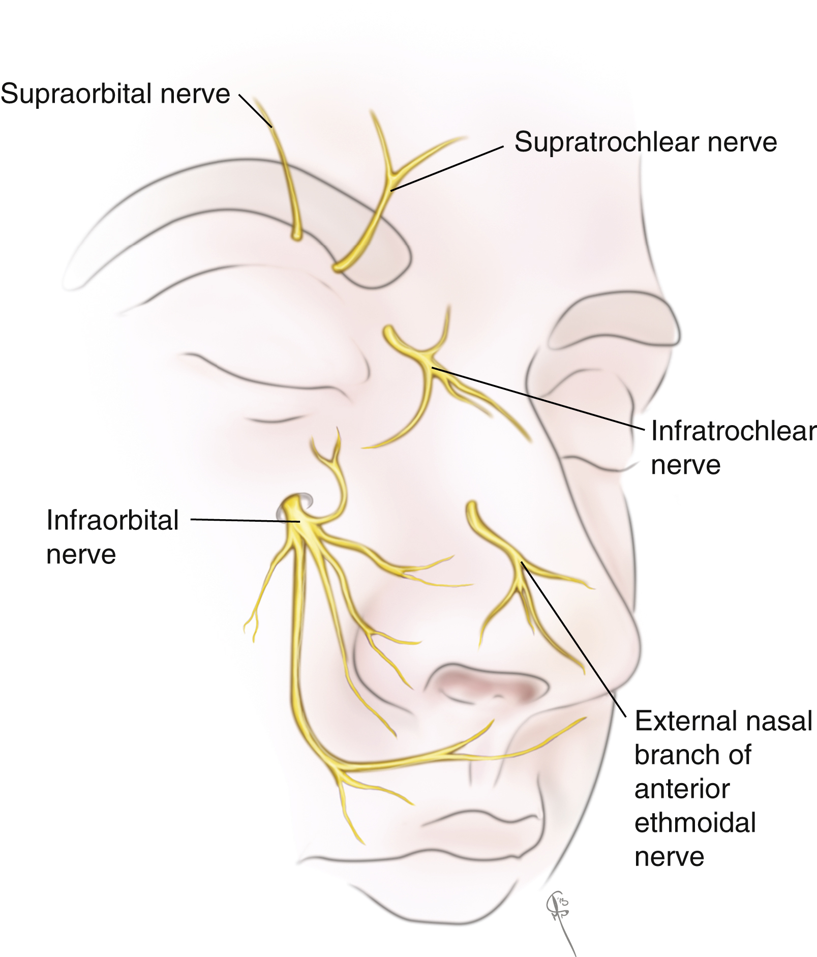 Branches of the second and third divisions of the trigeminal nerves provide sensory innervation of the nose while motor innervation is supplied by the zygomatic branch of the facial nerve. From V 2 , the ophthalmic nerve gives off the supratrochlear and infratrochlear nerves to supply sensation to the rhinion, radix sidewalls. The anterior ethmoid nerve gives off external branches that travel within the SMAS layer to supply sensation to the tip; therefore, careful dissection beneath the SMAS over the tip will preserve tip sensation. From V 3 , the maxillary nerve branches and supplies sensation to the lateral vestibule and columella ( Fig. 68.4 ).