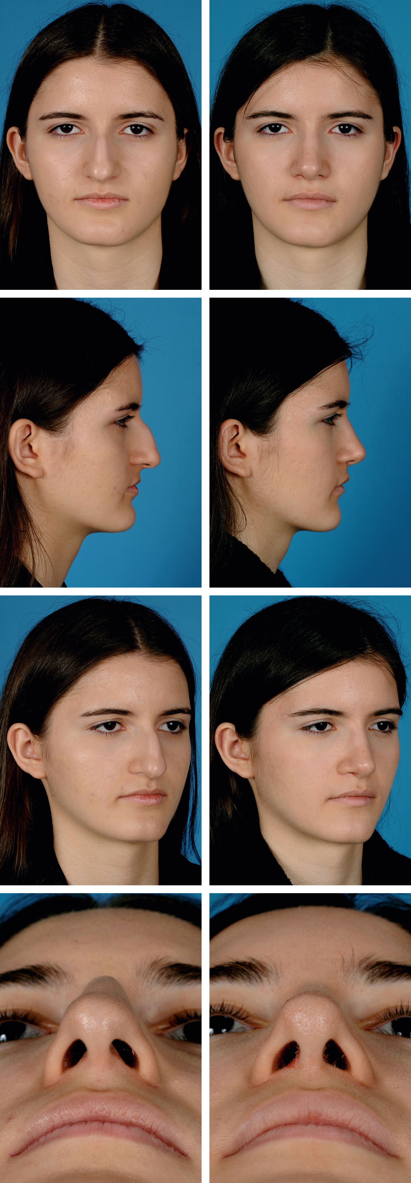 The standard approach to photography for rhinoplasty is to obtain realistic preoperative photography using a digital single lens reflex (SLR) camera. Photos should be taken with a standard blue background with appropriate lighting. Many surgeons will have a dedicated space for photography in their office. Standardization of patient positioning, lighting, and angles should be maintained. This will facilitate the surgeon’s study of the patient’s nasal anatomy and facial harmony for surgical planning. Moreover, it permits accurate pre- and postoperative comparison thereby facilitating the surgeon’s self-assessment and critique allowing continual refinement of surgical technique ( Fig. 68.5 ).