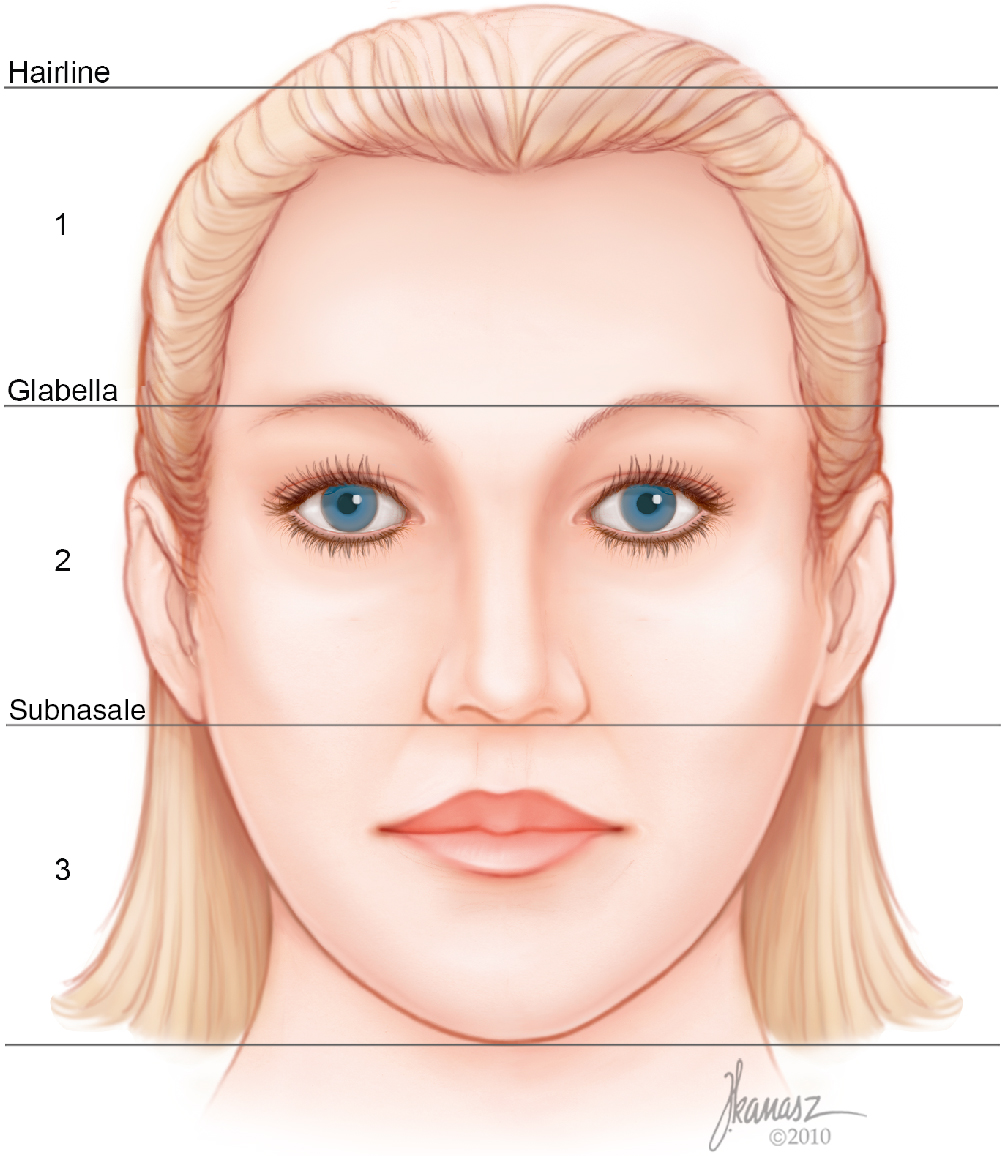 A methodical facial analysis for rhinoplasty requires a systematic and organized analysis of the face leading to detection of other facial as well as nasal flaws. The general features of the face, such as skin quality, color, and consistency, are observed first. Planning rhinoplasty for someone who has thin skin is going to be different from planning one for someone with thick skin. An optimal rhinoplasty outcome requires congruity between the nose and the rest of the face, as well as harmony among the different aesthetic units of the nose. It is for these reasons that a circumspect analysis of the entire face is essential. To ensure careful scrutiny of each segment of the face, one must divide the face into three different zones—upper, middle, and lower—and examine each segment starting from the cranial zone and continuing to the caudal portion of the face. These three zones then are compared with each other ( Fig. 28.1 ). This analysis of the three zones is completed both in the front view and the profile. Because many patients with deviated noses pluck their eyebrows differently, it is important to not use the point bisecting the distance between the eyebrows as a reference point for the facial midline or at least to pay attention to ensure that the eyebrows have not been plucked differently. Patients who have a narrow intercanthal distance should not have radix augmentation because it will produce the appearance of a reduction in the intercanthal distance. Conversely, patients who have an abnormally wide distance between the two canthi would have a positive change resulting from the dorsal and radix augmentation.