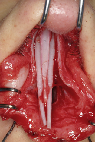 In some older patients, an excessively narrow middle nasal vault can result when weak upper lateral cartilages collapse inferomedially. Significant cartilage migration may also result in collapse of the internal nasal valve. These patients experience improvement in their nasal airway obstruction while performing the Cottle maneuver or with lateralization of the lateral nasal wall with an instrument. To correct this deformity, the surgeon can apply bilateral spreader grafts between the dorsal margin of the nasal septum and the upper lateral cartilages . These grafts are rectangular in shape and measure approximately 5 to 15 mm in length, 3 to 5 mm in width, and 1 to 2 mm in thickness.