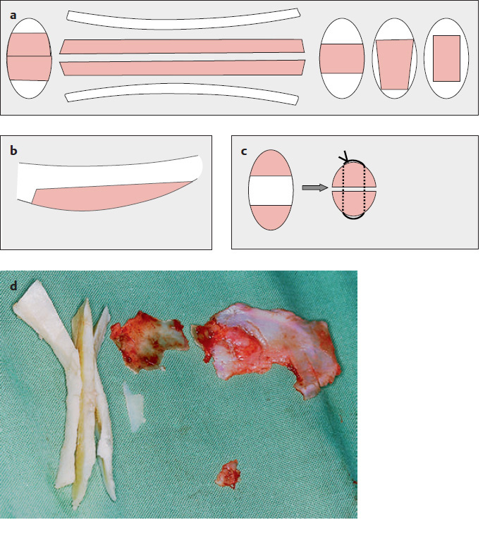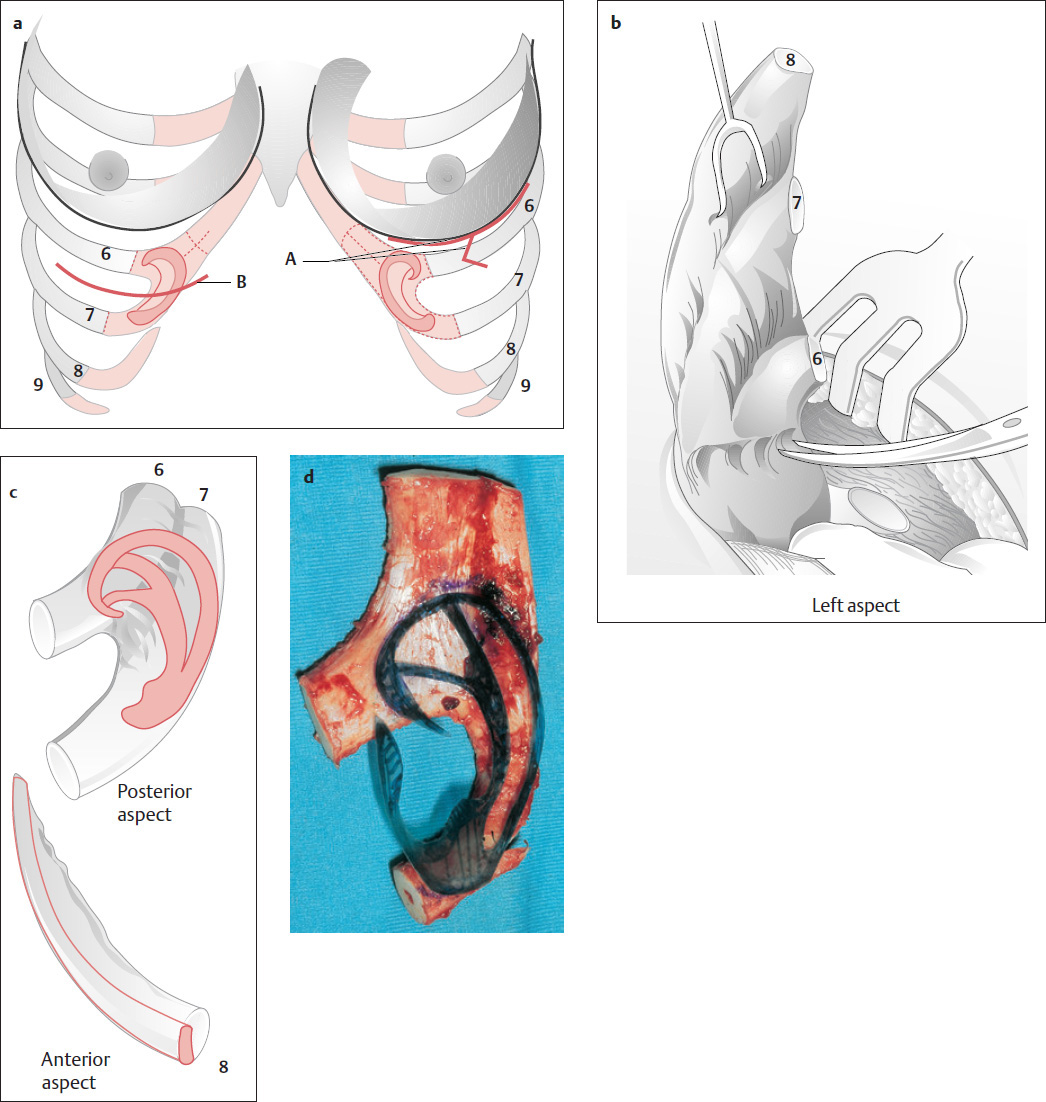 Rib cartilage is generally obtained from the same side of the thorax, under general anesthesia. Small amounts of cartilage can be taken from the fourth, fifth, or sixth rib, close to the sternum. We usually incise along the inframammary fold in women ( Fig. 11.1a , A) and parallel to the donor site in men ( Fig. 11.1a , B). The seventh rib is the longest cartilaginous rib and the last rib that extends to the sternum. The eighth rib is somewhat shorter and is often connected to the seventh rib by a synchondrosis. The sixth and seventh ribs generally supply a sufficient block to carve the body of the auricular framework ( Figs. 11.1 and 11.3 ). The eighth rib can be used to make the helical rim, if it is at least 8 cm long (preferably 9–10 cm).