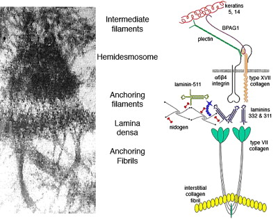 The BMZ of the skin contains a number of specialized adhesive structures, which help to promote tissue integrity in the face of disruptive external forces. At the superior aspect of the dermal-epidermal BMZ, intermediate filaments composed of keratins 5 and 14 insert on keratin linker proteins plectin and BPAG1 (BP230) as shown in Fig. 1 . BPAG1 and plectin in turn form an intricate and precise interaction with two transmembrane BMZ molecules α6β4 integrin and type XVII collagen (BP180/BPAG2). Collectively BPAG1, plectin, α6β4 integrin, and type XVII collagen comprise the electron-dense condensations of the keratinocyte plasma membrane as seen ultrastructurally by electron microscopy, which are termed “hemidesmosomes.” Jutting out below the hemidesmosome are small threadlike structures termed “anchoring filaments.” Anchoring filaments consist of or associate with type XVII collagen; α6β4 integrin; and two extracellular proteins, laminin-332 and laminin-311. These laminins assemble with other molecules including laminin-511, type IV collagen, and nidogen to form an electron-dense central structure of the BMZ termed the “lamina densa.” Finally, extending out perpendicularly as banded projections from the lamina densa are the anchoring fibrils. These structures contain polymeric associations of type VII collagen molecules, which intertwine between dermal interstitial collagen fibrils, joining the lamina densa to the papillary dermis. The dermal-epidermal BMZ serves to link the cytoskeleton of the basal epidermis, with the extensive network of interstitial collagen fibrils in the papillary dermis.