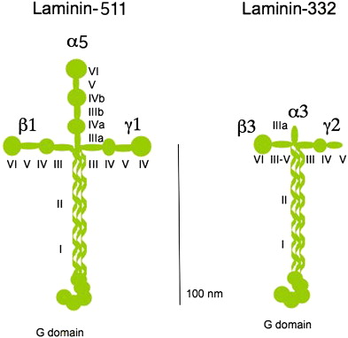 Laminin-332 is initially synthesized, assembled, and secreted by keratinocytes in a precursor form consisting of an α3 chain, γ2 chain, and β3 chain. Each of these chains is truncated compared with most other laminins, structurally depicted in Fig. 2 , by comparison with laminin-511, one of the other major laminins of the skin. Laminin-332 becomes even smaller after it is secreted, because it undergoes processing extracellularly at one position of its γ2 chain and at two positions of its α3 chain. The major processing enzyme is mammalian Tolloid, which is a member of the family of C-proteinases. The protein BMP-1 is another enzyme of this family that is less highly expressed in keratinocytes and fibroblasts in the skin. One of the processing sites, on the laminin α3 globular G3-4 domain, seems to have less specificity and non–C-proteinase enzymes, such as plasmin, and several MMPs has also been shown to cleave this domain. Processing of laminin-332 seems to play an important role in the skin, both during wound healing and carcinoma development.