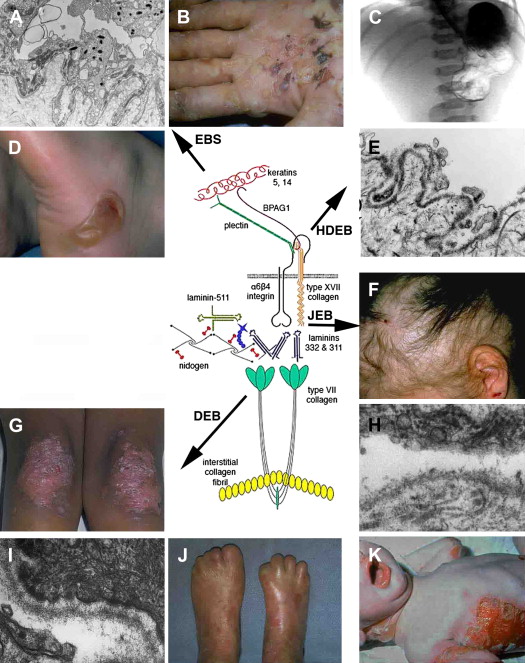 The crucial role of laminin-332 in epidermal adhesion was highlighted by the demonstration of its absence in the severe and lethal blistering Herlitz disease, junctional epidermolysis bullosa (JEB), a result of underlying laminin-332 gene mutations. JEB is just one of the many forms of epidermolysis bullosa (EB) and is characterized by intralaminar lucida blistering as depicted in Fig. 3 . JEB has largely been accepted as an untreatable genodermatosis. Recent studies have cast more light on potential therapeutic measures. Igoucheva and colleagues have demonstrated the applicability of using recombinant protein therapy for JEB by developing a protocol for production and purification of the active recombinant β3 chain that was incorporated into human keratinocytes that lack the β3 subunit. An animal model has also now been established, demonstrating the sustained phenotypic reversion of JEB in dog keratinocytes.