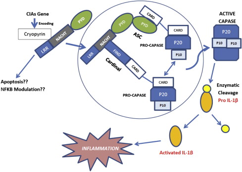 The complex detects pathogens and danger signals and induces the activation of the proinflammatory cytokines, which, in turn, attract inflammatory cells to deal with the infection or stressor. In autoinflammatory as well as allergic diseases such as contact hypersensitivity, bronchial asthma, and AD, dysfunctional inflammasome processing has been shown to account for IL-1β–induced inflammation. It is an IL-1 activating platform; cryopyrin (NLRP3, NLRP1), IPAF, and AIM2, are the key pathways to produce its activation, and have a role as key molecules in regulating the inflammatory cytokine processing platform. Fig. 2 shows a model proposed by Goldbach-Mansky of the mechanisms mentioned earlier. Cryopyrin, apoptosis speck protein (ASC), cardinal, and 2 procaspase-1 molecules assemble to form the cryopyrin inflammasome that activates caspase-1. Active caspase-1 enzymatically cleaves inactive IL-1β into its active form.