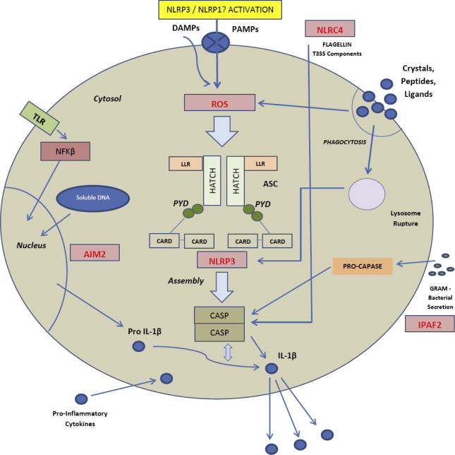 The activation mechanisms of the inflammasome have been studied to determine what subfamilies of NOD receptors produce cytokine activation and release on presentation of different activators. At present, there are 4 accepted mechanisms for which the inflammasome is activated: NLRP3 (activated by several mechanisms, including extracellular ATP from the foreign invaders, crystal molecules engulfed by the phagocytes, secreting lysosomes detected by the inflammasome or activated reactive oxygen species [ROS]. The final product is membrane pore formation), NLRP1 (found in experimental murine models, by an undefined mechanism, assuming to have similar pathways than NLRP3), IPAF (activated by gram-negative bacteria with type III or IV secreting substances), and AIM2 (a cytosolic double-stranded DNA sensor that induces caspase-1–dependent IL-1β maturation).