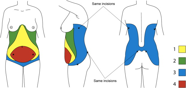 Anatomic zones by treatment. “X” marks indicate access incisions. (1) Continuously undermined area of final abdominoplasty flap extending inferiorly in a triangular fashion from the xiphoid, extending laterally to preserve the first 2 or 3 lateral perforators, extending further infero-laterally into the inferior portion of the flap. (2) Discontinuously undermined area of thoracoabdominal area lateral to the flap—extending superiorly over the anterior aspect of the ribcage to the inframammary fold, laterally to the anterior axillary line, and inferiorly to beyond the lateral edge of the abdominoplasty incision. (3) Remaining circumferential trunk—anteriorly to include the mons pubis, extending around the trunk to the back, limited superiorly by the inferior aspect of the axilla and lower edge of the scapula, limited inferiorly by the lowermost aspect of the hip mound and sacrum. (4) Abdominal pannus; to be excised.