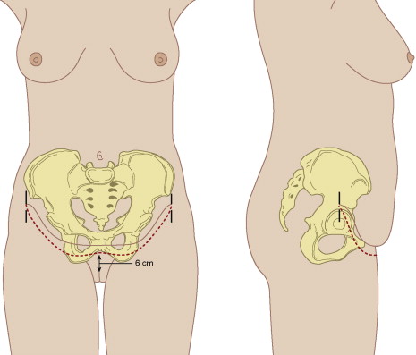 With the patient in the standing position, the anterior midline is marked from the xiphoid down to the anterior labial commissure. Using the top edge of the pubis as an underlying reference, the amount of lower abdominal skin ptosis is assessed, with the goal of producing a final scar location centrally to be at the top edge of the pubis. The lower abdominoplasty markings are made with the central point roughly 6 cm superior to the anterior labial commissure on full upward lifting of the skin (range of 4–7 cm), with a goal of elevating the ptotic mons pubis skin while allowing for full pannus excision ( Fig. 2 ). Usually the pannus includes all of the skin to above the umbilicus. If all of this skin cannot be excised to allow for closure, a small vertical closure results. If a vertical closure is unavoidable, the lower markings are placed as low as possible to allow the final scar to lie over the top edge of the pubis. Continuing laterally from the mons pubis, the markings are made with strong superomedial traction on the skin, using the desired location of the scar as a reference point. The desired location is directly over the top edge of the pubis centrally and 2 to 3 cm superior to the groin creases laterally, with the lateral aspect of the markings turning upward for the final 3 cm, stopping where no skin overhangs with light downward traction on the anterior abdominal skin. The upturned ends (2–3 cm) of the markings prevent downturned ends of the final scar location, allowing the final scar to run parallel to skin tension lines, in line with swimwear bottoms and without a conspicuous upturn or downturn of the ends of the scar. At the lateral extent of the markings, a reference mark drawn straight inferiorly is made to maintain orientation of the skin on closure. The strong medial advancement of the abdominoplasty flap can obscure the ends of the incision and these reference marks help maintain proper orientation. The lower abdominoplasty incision markings are not adjusted intraoperatively. Markings for the planned upper incision line gently arc to above the umbilicus or higher, depending on skin laxity with skin pinch, with the patient standing, bent forward with relaxed abdominal muscles. The markings for the upper incision line are only guides and are checked and verified intraoperatively, with the patient in the flexed position at the time of closure, with full downward tension on the abdominoplasty flap, just before excision of the pannus. The costal margins and xiphoid are marked as general reference points.
