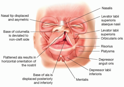 With an interruption of the orbicularis oris muscle in the unilateral cleft lip/nose, the other attached facial muscles pull the ala base more laterally compared to the noncleft side. The existing muscle imbalance also changes the position of the alar cartilage, as well as the orientation of the nostril from an oblique to a horizontal orientation.