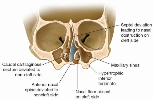 Septal deviation of varying degrees leads to posterior nasal obstruction on the cleft side due to the deviation of the septum and, often, the narrowing of the internal nasal valve.