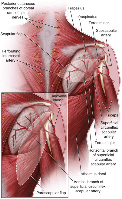 The skin and subcutaneous tissue of the back may be harvested as a flap supplied by the cutaneous or superficial branch of the circumflex scapular artery, originally named by Manchot. This branch is termed the “superficial circumflex scapular artery.” This skin artery divides into several branches: the horizontal (transverse) and vertical (descending), as well as the ascending and lateral branches. The horizontal and vertical branches supply the scapular and the parascapular cutaneous flaps, respectively.