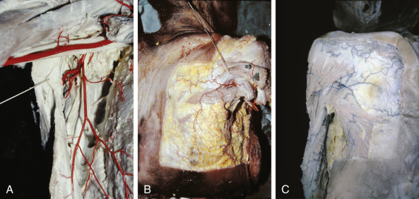 Anterior view of the right axilla of an anatomic specimen injected with colored latex. (A) The anterior lateral border of the latissimus dorsi muscle is retracted with a hook. The axillary artery, the subscapular artery, and its division into the circumflex scapular and the thoracodorsal arteries are observed. (B) Same specimen, posterior view. The superficial circumflex scapular artery and its branches are observed emerging from the triangular space. Part of the subcutaneous tissue has been removed around that space in order to show the anatomic landmarks (teres minor and major muscles). (C) Anatomic specimen injected with blue latex through the subclavian artery. The superficial circumflex scapular artery is observed.