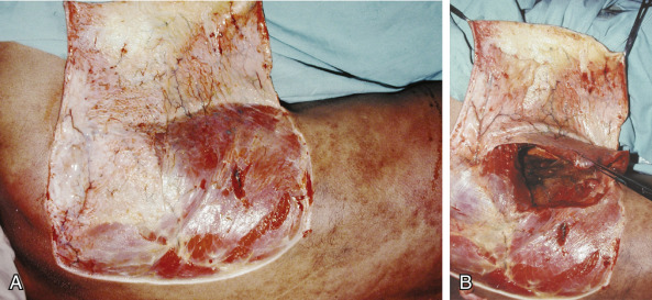 With the arm adducted, the lateral border of the scapula indicates the direction of the vertical parascapular branch. The longitudinal axis of the flap follows this line. The proximal end of the flap is placed at the axillary crease. The distal end reaches the 12th rib. The amount of laxity allows determination of the width that can be harvested to allow for primary closure.