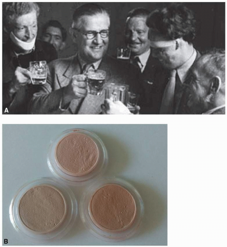 There is evidence to suggest that cosmetic preparations and prostheses have been used to cover scars since antiquity.1 The history of skin camouflage, as we know it today, began during World War II by the innovative plastic surgeon, Sir Archibald McIndoe, at the Queen Victoria Hospital, East Grinstead, West Sussex, England.2 His patients were all Royal Air Force (RAF) aircrew with burn injuries who formed (1941) The Guinea Pigs Club (28 founding members, 649 by the end of the war), which is acknowledged as being the first patient support group founded by patients for patients. McIndoe3 would proudly state, “It has been described as the most exclusive club in the world, but the entrance fee is something most men would not care to pay and the conditions of membership are arduous in the extreme” (see Fig. 20-1A).