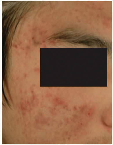 FIGURE 18-2 Postinflammatory hyperpigmentation on right temporal and malar areas associated with active inflammatory acne in a Chinese man.