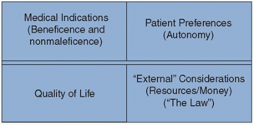 A well-regarded contemporary approach to assessing clinical ethical issues is Jonsen, Siegler, and Winslade’s use of four different categories to analyze the issues: medical indications, patient preferences, quality of life, and contextual features.6,7 Medical indications refer to the clinical facts of the medical situation and the goals of treatment. Patient preferences relate to the principle of respect for autonomy: has the patient been informed about the appropriate risks and benefits and have any choices or predilections been expressed? Quality of life explores the probable future of a patient, with or without treatment. Under this heading, the risks, benefits, and potential side effects are weighed in order to ascertain potential medical outcome. The contextual features category examines issues of justice, fairness, and disparities, for instance, whether there are entities outside of the physician and the patient that may be affected, including family members, the health care organization, or society at large (Fig. 4-1).