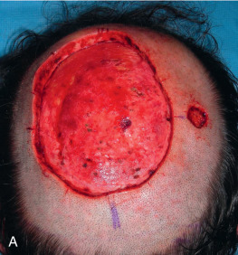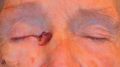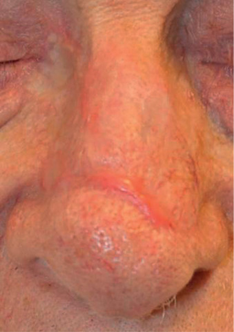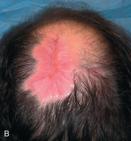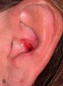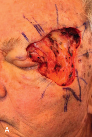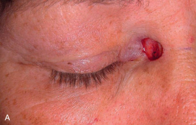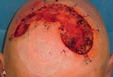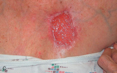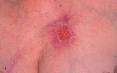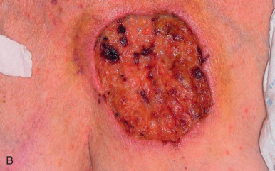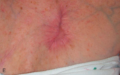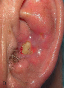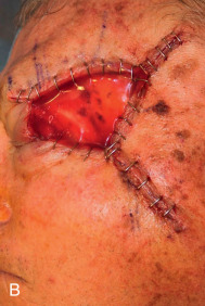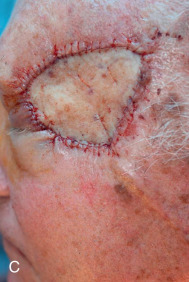 Failure to account for contraction can lead to anatomic distortion after SIH of wound near free margins, such as the nasal ala and eyelid. Formation of excess granulation tissue can delay healing ( Fig. 3.10 ). High potency topical steroids reduce granulation tissue and speed healing. Erosive pustular dermatosis is thought to be associated with trauma, and can occur with SIH. As it is easily confused with infection, the surgeon must be aware of this potential complication. It is commonly treated with topical corticosteroids. Newly re-epithelialized wounds tend to be more fragile and can be easily sheared with incidental trauma. Contour of the healing wound is unpredictable, so wounds may heal with either hypotrophic or hypertrophic scars.