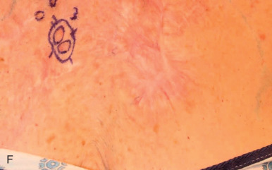 The texture and color of the surrounding skin may influence the appearance of SIH scars. The shiny scar from SIH may contrast sharply in locations with textured skin, such as a sebaceous nasal tip ( Fig. 3.6 ). By contrast, the shiny scar from SIH is often inconspicuous in locations with tight, shiny skin, such as the ear. The surgeon must anticipate the likely result from a primary closure versus SIH. In some locations, such as the upper back and shoulders, linear scars have a tendency to spread and often become more noticeable than a smaller circular scar from second intention healing.