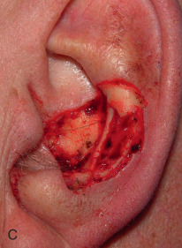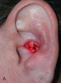 Some wounds have predictably poor outcomes from SIH. Wounds near the eyelid, ala, and lip may contract and distort these free margins ( Fig. 3.7 ). SIH of wounds with exposed “white structures,” such as bone, cartilage, and tendons, may result in desiccation and prolonged healing. If soft tissue coverage of exposed bone and cartilage is not possible, fenestration of exposed cartilage and burring of exposed bone may improve the blood supply and promote healing ( Fig. 3.8 ). Finally, SIH may distort contours when wound contraction places tension on nearby loose skin.