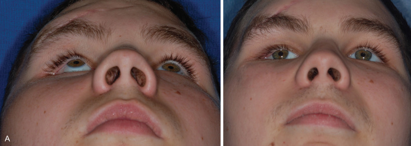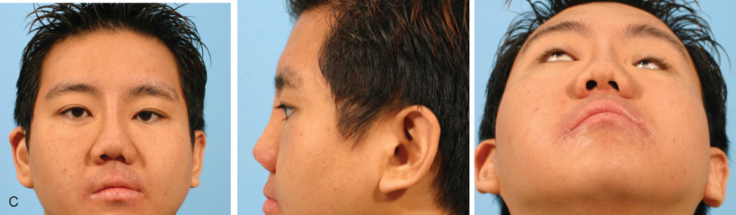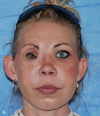 When the medial canthal tendon is displaced laterally with the bony medial orbital wall, either due to NOE or Le Fort III fracture with comminution, this results in medial orbital wall hypertelorism. Poor frontonasal angle and poor nasal projection combined with associated telecanthus or traumatic orbital hypertelorism compound the severity of the apparent deformity making the patient look worse ( Fig. 3.8.4A–C ).