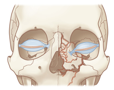 A high-quality CT scan with no more than 1.5 mm thickness axial and coronal cuts confirms the diagnosis of secondary nasoethmoid fracture. Two-dimensional axial and coronal images provide a blueprint for the surgical plan, including planning the incision, use of bone grafts, location of osteotomies, and avoidance of adjacent structures. After cross-sectional imaging has been evaluated, three-dimensional reconstructions may be utilized to refine and improve the assessment. Care should be taken not to rely on 3-dimensional reconstructions in isolation to avoid underestimation of the details of the fracture . The surgeon should be mindful that abnormal bony and soft tissue densities from scarring or edema may be present and obfuscate anatomic boundaries in secondary nasoethmoid fractures. This may complicate the determination of the fracture pattern, degree of comminution, and displacement, which must be considered in the development of an adaptable surgical plan.