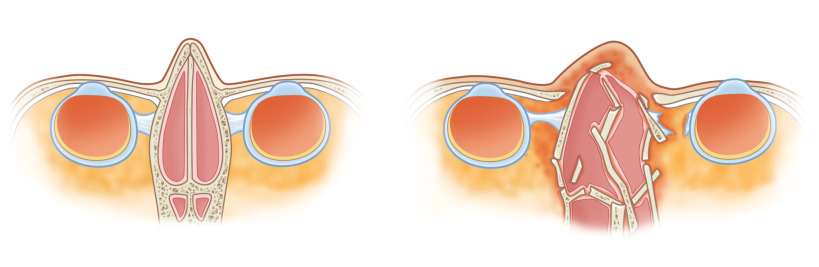 Comparison of normal and traumatized nasoethmoid region anatomy. Medial orbital walls with medial canthal tendons displaced laterally. Radix of nose telescopes in. Chronic edema can be present. Collapse of the septum and vomer is frequently seen.