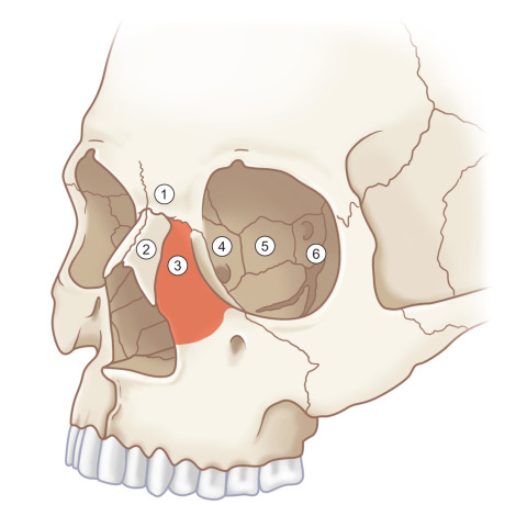 Nasoethmoid region osseous components: (1) nasal process of frontal bone; (2) nasal bones; (3) nasal process of maxilla; (4) lacrimal bone; (5) lamina papyracea; (6) lesser wing of sphenoid bone. The key central bone fragment is shaded.