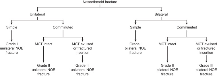 Classification of nasoethmoid fractures. *NOE = nasoethmoid; MCT = medial canthal tendon.