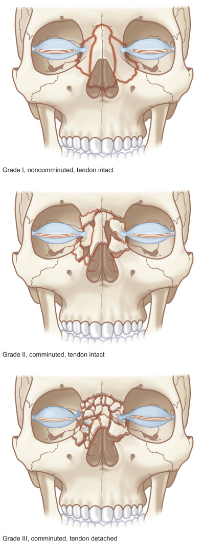 Nasoethmoid fracture grading system. In descending order: (1) Grade I noncomminuted, tendon intact; (2) grade II comminuted, tendon intact; (3) grade III comminuted, tendon detached.