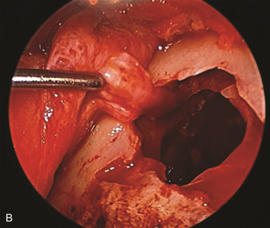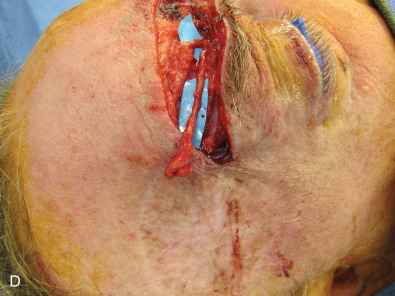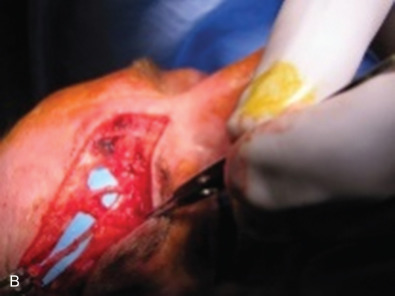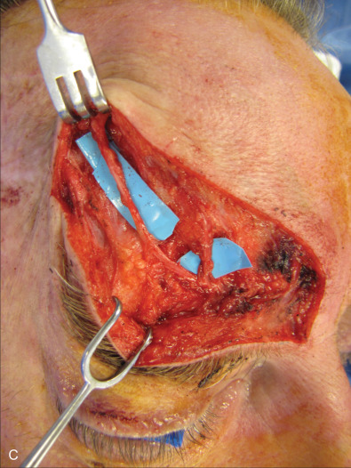The three branches of the trigeminal nerve, ophthalmic, maxillary, and mandibular nerves, exit the skull through separate foramina: superior orbital fissure, foramen rotundum, and foramen ovale respectively ( Fig. 3.16.1 ). The largest branch of the ophthalmic nerve is the frontal branch. This branch will divide within the orbit to give the terminal branches of the supraorbital and supratrochlear nerves. These nerves give sensation to the upper eyelid as well as the central or lateral forehead. Classically, these nerves can be released from their bony foramina or notch to gain release of the forehead soft tissue to facilitate access to the upper facial skeleton via a coronal approach ( Fig. 3.16.2 ).