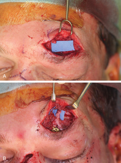 Direct injury to the temporalis muscle from trauma or surgical access can also result in tissue loss, atrophy or ptosis. In traumatic injuries repair and resuspension of the muscle should be performed as best as possible with priority placed on filling the anterior portion of the temporal fossa adjacent to the lateral orbital rim and zygomatic arch ( Fig. 3.3.5 ). Resuspension is facilitated through use of drill holes, suture anchors or fixation to fracture plates. If elevation of the temporalis muscle is required for surgical access to the lateral skull base, a cuff of muscle and fascia at the superior temporal line should be left to facilitate accurate resuspension.