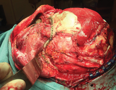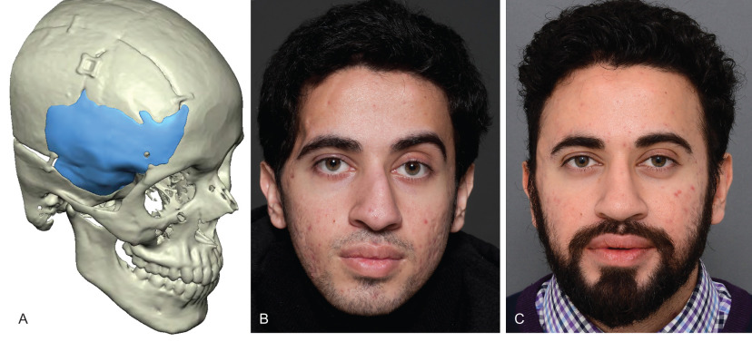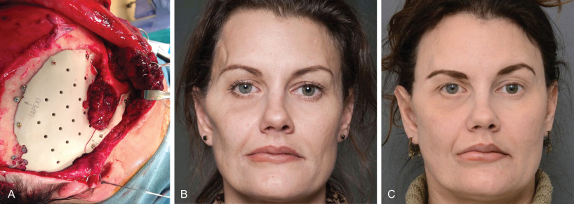Fig. 3.3.3 demonstrates a patient following a motor vehicle collision resulting in a compound skull fracture and loss of the right zygomatic arch. Initial treatment of the patient’s skeletal defects was limited due to their critical condition and severe neurotrauma. Following the acute phase, staged secondary reconstruction was planned. First, a custom made PEEK implant to address the cranial and zygomatic defects was designed based on CT imaging. Following skeletal correction, the true soft tissue deficit in the temporal fossa became apparent and could be appropriately addressed. Serial fat grafting was then employed to complete the soft tissue reconstruction.