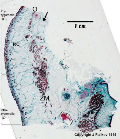 Ptosis of cheek tissues is a well-known complication following subperiosteal degloving of the midfacial skeleton. The anterior surface of the maxilla and zygoma are the origin of attachment for the muscles of the upper lip, as well as the suspensory ligaments supporting the midface soft tissue. Release of these periosteal attachments therefore results in descent of the midface and cheek soft tissues. This retinacular support system starts at the periosteum and forms an arborized pattern as it connects to the superficial musculoaponeurotic system (SMAS) before finally inserting into the dermis. A histological depiction of this is shown in Fig. 3.3.7 .