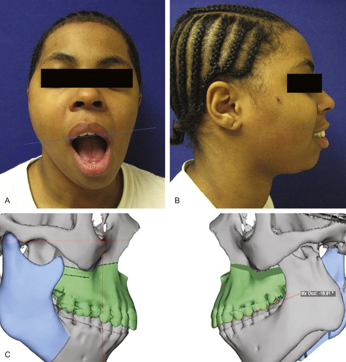 Posttraumatic unilateral condylar hypoplasia, malunion with displacement in a young patient. Note chin deviation on opening to the affected side. The 3D reconstructed image (C) demonstrates the extent of left condylar hypoplasia.