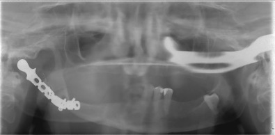 The fibula free flap (FFF) has become a widely accepted autologous reconstructive option for segmental mandibular defects after resections for cancer, benign tumors, trauma, or osteonecrosis. Advantages of this flap include the ability to repair soft-tissue composite defects, excellent bone length that can be shaped to fit the anatomical need, vascularized bone that resists resorption, suitability for dental implant placement and so allowing dental rehabilitation, and finally the ability to have a two-team approach reducing anesthesia time. Garcia et al. reported six patients who underwent mandibular resection including the condyle and reconstruction using FFF where in all the cases, the fibula was placed directly into the glenoid fossa. The temporomandibular disc was preserved over the condylar end of the fibula. Panoramic radiographs were performed postoperatively to evaluate condylar position and grade of bone resorption. Five of the patients developed good function whilst one fibula ankylosed, concluding the use of the FFF directly fitted into the glenoid fossa is a reliable method in condylar reconstruction but the risk of ankylosis persists. Other options include fitting a prosthetic condyle onto the fibula to articulate against the articular eminence or where the native condyle is preserved, then this can be fixated directly onto the fibula graft. Figs. 3.10.4–3.10.8 illustrate secondary reconstruction of the TMJ with a fibula graft where primary reconstruction failed after many years.