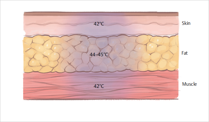 A common question asked during fat reduction consultations is how BTL Vanquish ME can heat the subcutaneous fat to a degree that initiates induced apoptosis without causing thermal injury to the skin, muscle, and deeper structures. Skin and muscle tissue contain a significant amount of water while fat does not. Radiofrequency waves travel easily through water and therefore penetrate the skin quickly, but are unable to get past the subcutaneous fat layer. Only when impeded in the subcutaneous fat layer does the energy heat to apoptotic temperature levels. The energy is essentially trapped in the fat layer leaving minimal risk to the muscle and deeper structures (▶Fig. 6.1). Patients feel what has been described as “a comfortable warmth” and often times find the treatment pleasurable. The combination of the skin temperature remaining at a lower degree than the adipose tissue and the device’s multiple skin cooling features contribute to patient comfort during treatment.