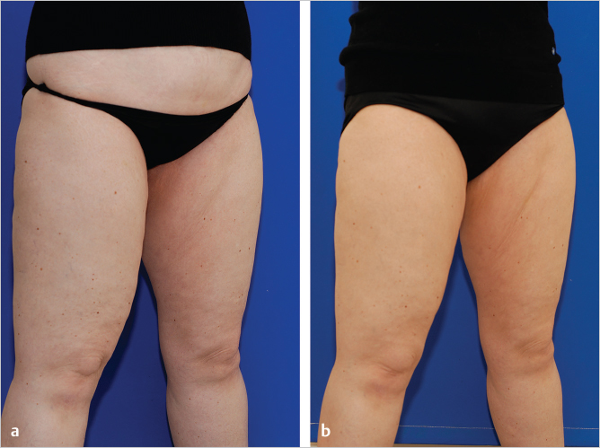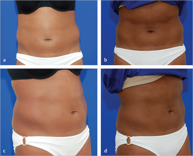 Patients who are good candidates, are well-hydrated, and treated by trained practitioners can expect to see results after a series of BTL Vanquish ME (▶Fig. 6.7). As with any surgical or non-surgical procedure results vary from person to person. A good consultation with an emphasis on realistic expectations will heavily influence a patient’s perception of treatment success. A Vanquish ME series always begins with a pre-procedure set of photographs using the BTL floor mat to ensure identical foot positioning in the before and after photos. In our practice, the protocol for mid-section photographs has patients lift their arms straight out in front of them so that they are perpendicular to the body. Arms should never be lifted above shoulder height as this position stretches out the torso, distorting the baseline anatomy. In addition to photographs, it is common for providers to measure the treatment area before treatment and one month after the last treatment to quantify centimeters lost. The positioning and tension of the tape measure must be identical in the before and after measurements in order for this to be an accurate tool to assess results. The lack of reliability in circumferential measurements has led many providers to rely on photographs alone to document change. Patients see and feel the difference in their clothes and that is the ultimate gauge of success. The other methods of measuring fat reduction are caliper measurements, bioimpedance-based scale measurements, ultrasound, and most recently magnetic resonance imaging (MRI). 6