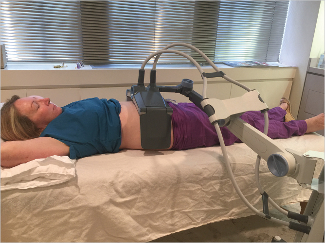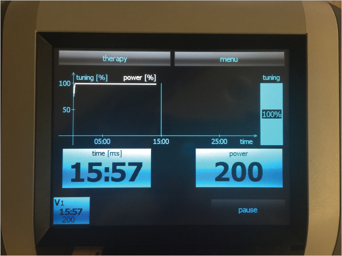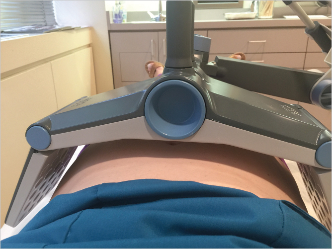 During a treatment the patient lies underneath the device’s large spot, non-contact applicator which attaches to an “arm” that is designed to optimally position the applicator (▶Fig. 6.3). The official recommendation is for the applicator to be positioned 10mm away from the skin on all three sides. In our practice we aim to get the applicator as close to the skin without touching as possible (▶Fig. 6.4). It is imperative that the physician or physician extender take as much time as needed to get the applicator in close proximity to the skin. The “arm” of the device has three components that can be adjusted independently to customize the applicator positioning to the patient’s frame. The side panels are flap-like structures that can be moved up and down to further fine tune the set up. Once the set up is complete the operator can begin the treatment.