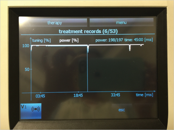 Vanquish ME offers a maximum of 200 watts of radiofrequency energy and the wattage is titrated to the highest amount possible while maintaining a tuning of greater than 90% (preferably >95%). If the tuning drops below 90%, the wattage should be decreased until it returns to a minimum of 90%, ideally 95% or greater (▶Fig. 6.5). A common misconception is that the higher the wattage, the greater the amount of induced apoptosis that will occur, however this is not the case. Vanquish ME is most effective when operating at a wattage that provides the greatest efficiency. The output and absorption are measured and these numbers should be as close together as possible (▶Fig. 6.6). A wide discrepancy between these two calculations indicate inefficiency, and therefore less efficacy. There are multiple reasons why the optimal wattage varies from patient to patient, and treatment to treatment in the same individual. Patients with larger amounts of subcutaneous fat will absorb more radiofrequency energy than patients with smaller treatment areas. Typically the wattage for optimal absorption decreases as patients have more treatments and the fat layer gets smaller. This may not be the case with larger patients who can sustain the highest wattage for the entire Vanquish ME series. Device operators should keep in mind that if a patient has a substantial layer of fat but is unable to maintain a high wattage throughout treatment, the applicator might be too far away from the skin. If this is the case the device can be paused to allow for repositioning of the applicator. The side panels can often be adjusted without treatment interruption. If a patient is not well-hydrated, the radiofrequency energy is unable to penetrate the skin effectively and there will be less energy available to the fat layer for absorption.