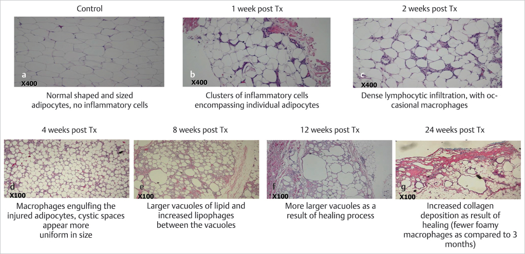 Immediately after treatment, an inflammatory response is initiated. Ultrasound imaging of the treatment zone demonstrates evidence of an immediate inflammatory response with the appearance of a “cloud” (▶Fig. 3.1). Within one week of treatment the response appears uniformly through the entire treatment area. Histological examination of the treatment area demonstrates lymphocyte infiltration within 2 weeks followed by invasion of macrophages resulting in phagocytosis of injured adipocytes with vacuole formation. By 2–3 months after treatment, macrophages surround the adipocytes with significant reduction in adipose tissue volume (▶Fig. 3.2). 6