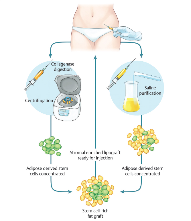 The improvement of surgical techniques in autologous fat transplantation has increased the survival rate of the grafted fat and has reduced the side effects such as fat necrosis. Several mechanisms may contribute to the variability of outcomes for fat-grafting procedures. The harvesting process is traumatic to adipocytes, which can lead to apoptosis. Additionally, results for recipient wound beds with different degrees of blood supply and fluctuations in oxygen delivery may range from adequate revascularization and good “take” to insufficient revascularization and ischemia, apoptosis, and dedifferentiation of central adipocytes. 1 A significant proportion of the engrafted fat undergoes resorption and necrosis due to the non-vascularized nature of the transplant. Resorption rates after fat grafting are generally reported to be between 20 and 80%. 2 Therefore, in order to maximize survival, multiple passes in different tissue planes are required in order to optimize plasmatic imbibition and neovascularization of the transplanted fat grafts. Injection of the fat graft should be met with minimal resistance and a small volume is administered upon entry with the remaining volume given during withdrawal to minimize trauma. Adipose tissue is composed of mature adipocytes constituting about 90% of the tissue volume, and a stromal vascular fraction (SVF) including fibroblasts, endothelial cells, preadipocytes, vascular smooth muscle cells, lymphocytes, resident monocytes/macrophages. It has become apparent over the years that white adipose tissue (WAT) is the most suitable autologous injectable filler for correcting soft tissue defects. 3 Adipose tissue is considered as a source of mesenchymal stem cells (MSCs), termed adipose-derived stem cells (ADSCs). They are ubiquitous and easily obtained in large quantities with little donor site morbidity or patient discomfort making the use of autologous ADSCs an appropriate cellular therapy. The use of ASCs may enhance angiogenesis, improve the survival of grafts, and thus reduce atrophy of the fat grafting. 4 ADSCs have been evaluated in clinical studies for soft tissue augmentation and represent a novel approach to cell-based therapies, such as autologous fat transplantation. Nowadays, autologous fat transplantation or adipose cell grafting incorporates adipocytes, ADSCs and growth factors already present in the lipoaspirate. The SEL is a new surgical technique of autologous fat grafting for body contouring which converts a stem cell poor fat graft to a stem cell rich fat graft. 5 The clinical outcomes of scientific research in the last decade have shown that SEL is one of the core elements of regenerative medicine.