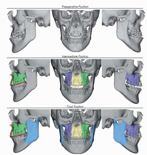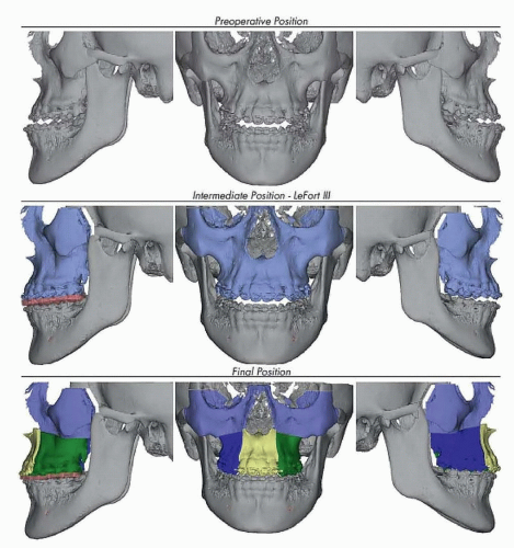 FIG 5 • Virtual surgical plan of combined Le Fort III osteotomy and advancement with three-piece Le Fort I segmentation.
