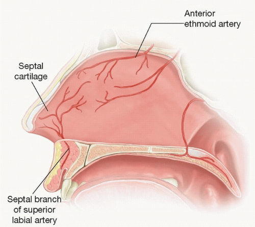 Septal mucoperichondrium is supplied by the paired septal branches of the superior labial arteries and paired anterior ethmoidal arteries5,6 (FIG 1).