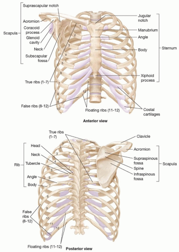 • The skeletal system is composed of 2 clavicles and 12 paired ribs, which in turn articulate posteriorly with the thoracic vertebrae’s costal facets and transverse processes as well as anteriorly with the sternum via costochondral joints. The 8th to 10th ribs are referred to as “false” ribs as they lack direct sternal attachments, whereas ribs 11 and 12 are termed the “floating” ribs (FIG 1).