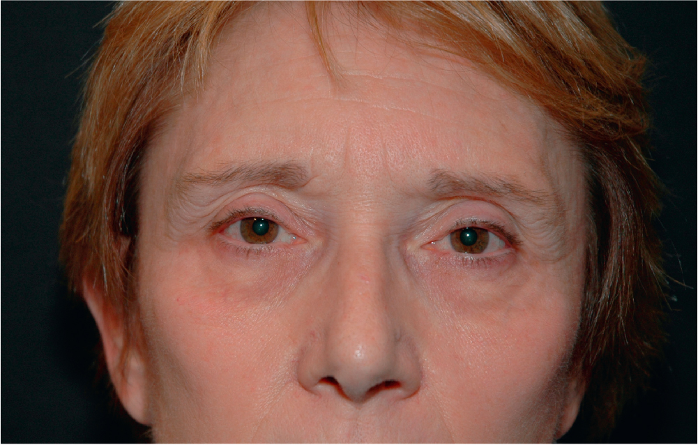 The same patient in Fig. 38.1 is shown 8 months after undergoing a brow lift procedure in conjunction with fat grafting to her upper eyelid sulcus. She has also undergone lower eyelid fat transposition into the tear trough.