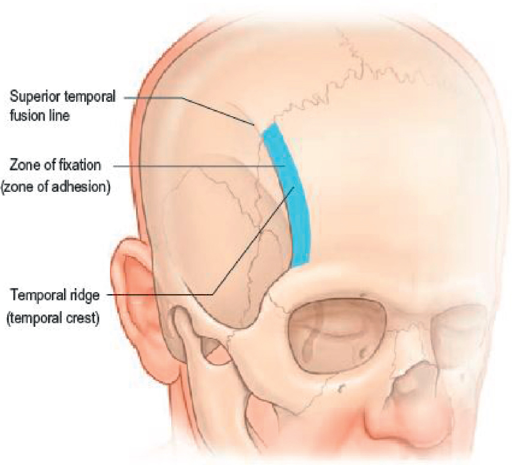 The lateral portion of the frontal bone is crossed by a curved ridge called the temporal crest (also called temporal ridge or superior temporal fusion line of the skull ). This is a palpable landmark that separates the temporal fossa and the origin of the temporalis muscle from the forehead portion of the frontal bone. The blue band represents the zone of fixation (zone of adhesion) along which fascial layers are tethered to bone.