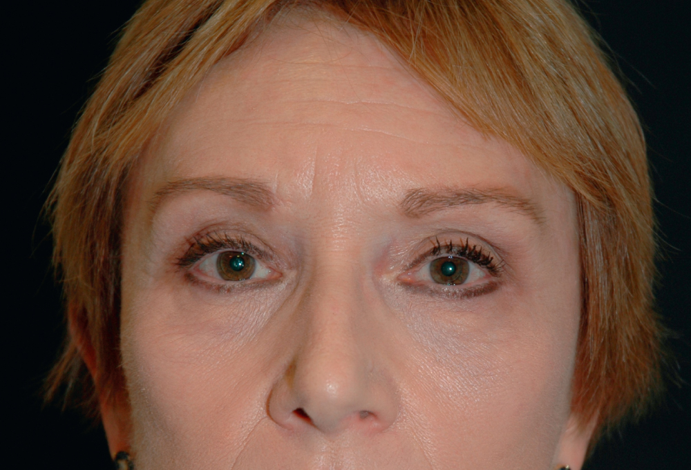 This middle-aged woman has developed eyebrow ptosis as well as loss of orbital fat in her upper eyelid sulcus.