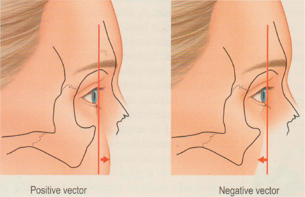 The Jelks relationship between the anterior projection of the globe and the anterior projection of the cheek soft tissue mass. A positive relationship is said to exist when the cheek mass is anterior to the cornea. This is the normal youthful condition. A negative vector is present when the anterior projection of the cheek mass is posterior to the plane of the cornea. This occurs in patients with maxillary hypoplasia and/or cheek soft tissue deficiency, both of which can be congenital or acquired through aging. A negative vector relationship predisposes to lower lid malposition after lower lid blepharoplasty.