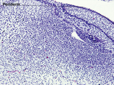During the first weeks of life, the fetus is covered by a layer of nonkeratinizing cuboidal cells called the periderm ( Fig. 1.2 ). Later, the periderm is replaced by a multilayered epidermis. Adnexal structures, particularly follicles and eccrine sweat units, originate during the third month of fetal life as downgrowths from the developing epidermis. Later, apocrine sweat units develop from the upper portion of the follicular epithelium and sebaceous glands from the midregion of the follicle. Adnexal structures appear first in the cephalic portion of the fetus and later in the caudal portions.