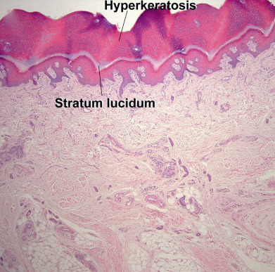 The epidermis can be divided into the innermost basal layer (stratum germinativum), the malpighian or prickle layer (stratum spinosum), the granular layer (stratum granulosum), and the horny layer (stratum corneum). On the palms and soles, a pale clear to pink layer, the stratum lucidum, is noted just above the granular layer ( Fig. 1.3 ). When the skin in other sites is scratched or rubbed, the malpighian and granular layers thicken, a stratum lucidum forms, and the stratum corneum becomes thick and compact. Histones appear to regulate epidermal differentiation, and histone deacetylation suppresses expression of profilaggrin. Slow-cycling stem cells provide a reservoir for regeneration of the epidermis. Sites rich in stem cells include the deepest portions of the rete, especially on palmoplantar skin, as well as the hair bulge. Stem cells divide infrequently in normal skin, but in cell culture they form active, growing colonies. They can be identified by their high expression of β1-integrins and lack of terminal differentiation markers. Stem cells can also be identified by their low levels of desmosomal proteins, such as desmoglein 3. The basal cells divide, and as their progeny move upward, they flatten and their nucleus disappears. Abnormal keratinization can manifest as parakeratosis (retained nuclei), as corps ronds (round, clear to pink, abnormally keratinized cells), or as grains (elongated, basophilic, abnormally keratinized cells).